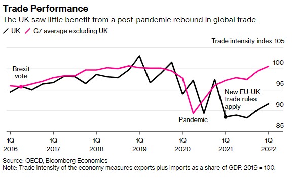 彭博经济(Bloomberg Economics)的分析数据显示,在新冠疫情前,英国的贸易表现落后于其他大国,并且自疫情以来,英国未能充分参与全球贸易反弹。